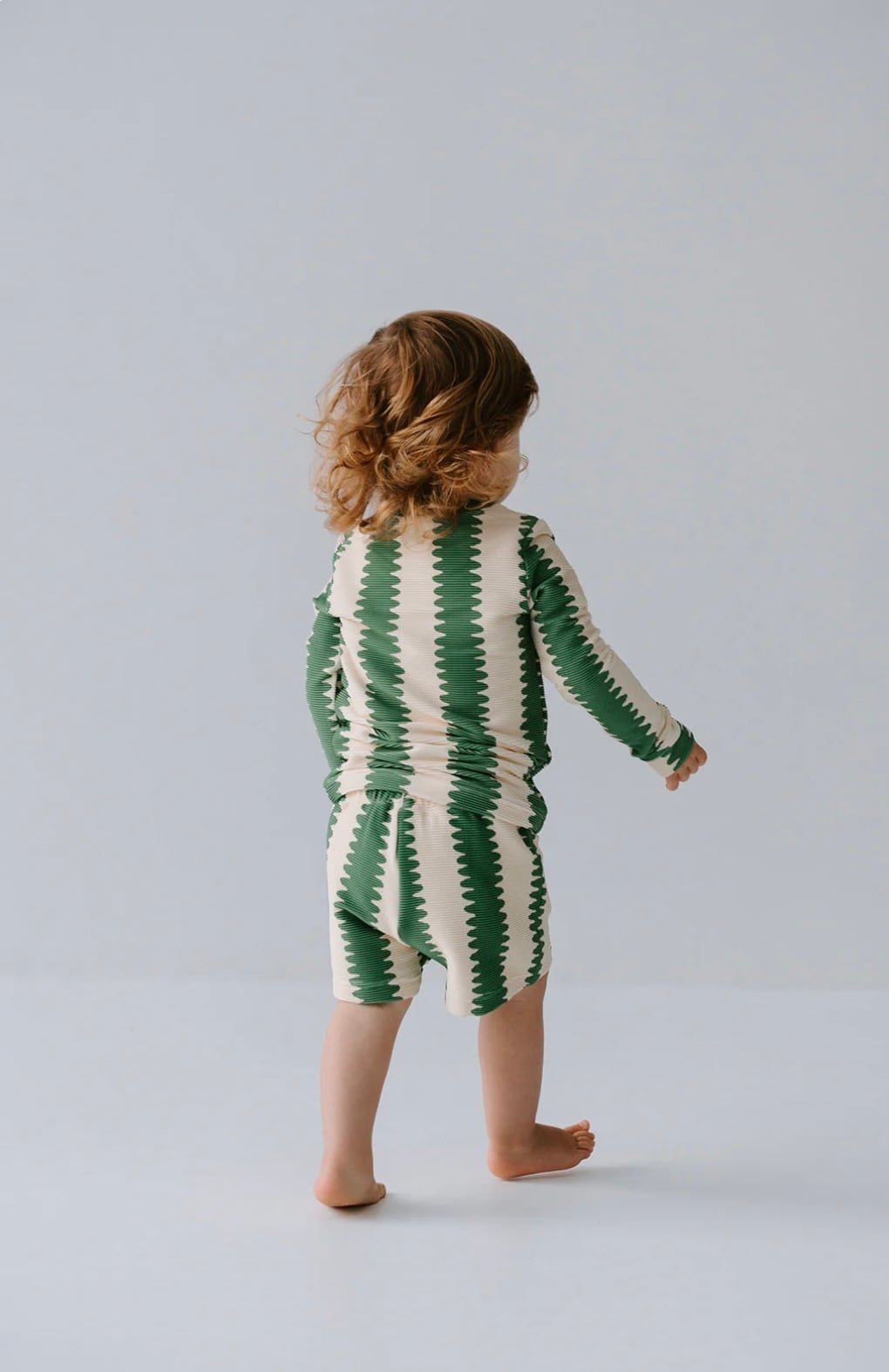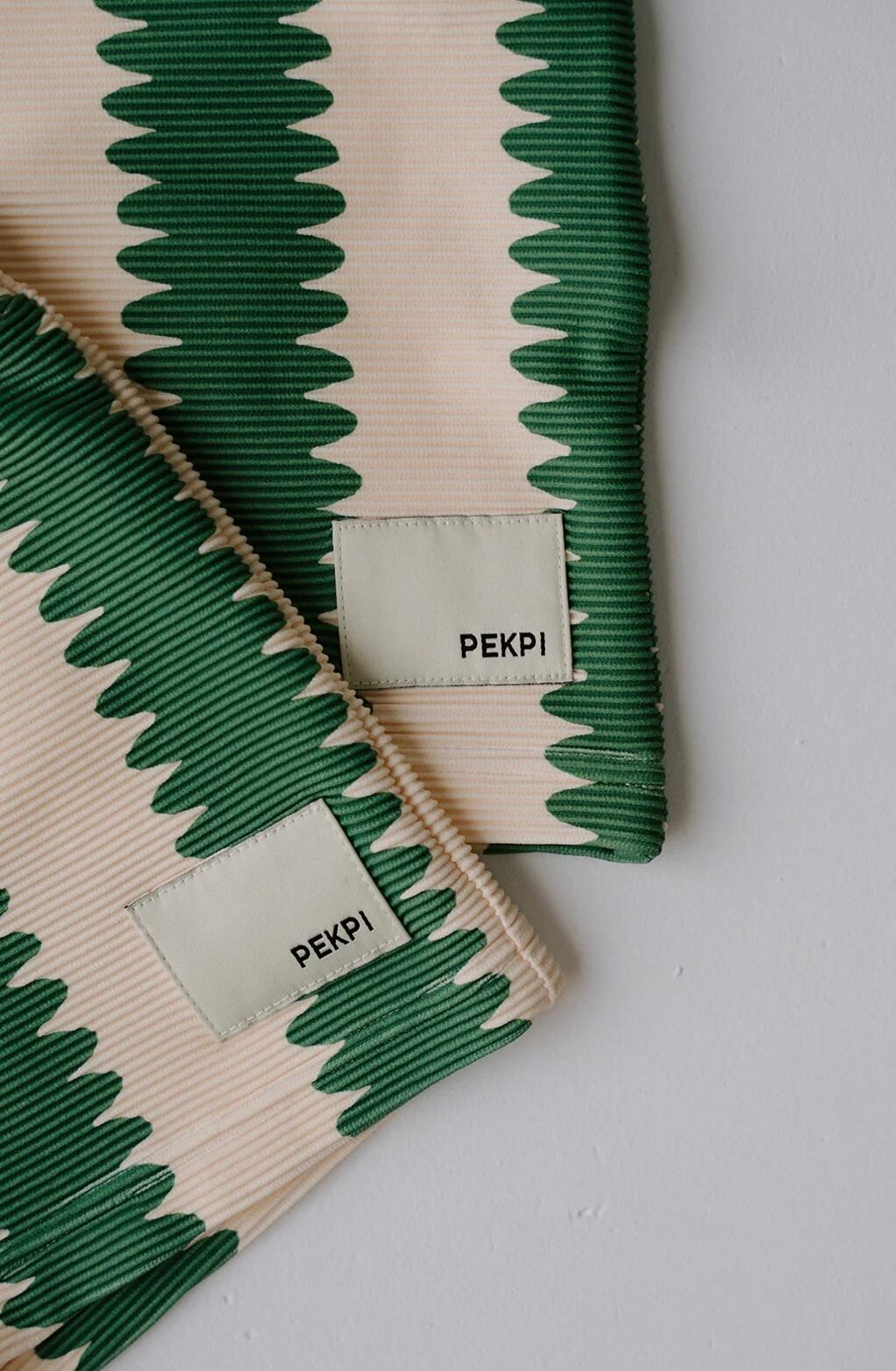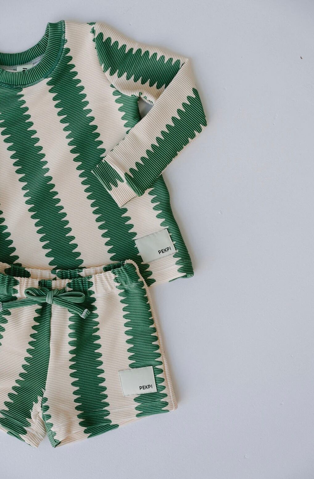 リブ生地に遊び心のあるグリーンのウェーブストライププリントが特徴です。